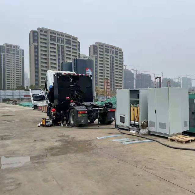 受接入的施工用電線路功率限制,現(xiàn)有配電箱無(wú)法滿足新增打樁設(shè)備用電需求。按常規(guī)做法需增設(shè)柴油發(fā)電機(jī),但此類型發(fā)電機(jī)噪音大,排放高溫廢氣,不符合現(xiàn)代社會(huì)節(jié)能環(huán)保的大趨勢(shì)。因此,本項(xiàng)目率先引進(jìn)無(wú)噪音、無(wú)廢氣排放的鋰電移動(dòng)儲(chǔ)能動(dòng)力站與施工用電線路并網(wǎng),在施工用電低谷期間進(jìn)行電池充電,樁基施工用電高峰期間補(bǔ)充電力缺口。如接入的施工用電線路長(zhǎng)期滿載,可由儲(chǔ)能動(dòng)力站廠家運(yùn)送滿電電池進(jìn)行現(xiàn)場(chǎng)換電,將缺電電池運(yùn)回充電。