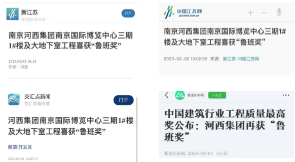 編者按:企業(yè)高質(zhì)量發(fā)展,離不開(kāi)高品質(zhì)的產(chǎn)品。2022—2023年度第一批中國(guó)建設(shè)工程魯班獎(jiǎng)名單近日公布,由河西集團(tuán)投資,集團(tuán)新城公司代建的南京國(guó)際博覽中心三期1#樓及大地下室工程榜上有名。對(duì)此,交匯點(diǎn)新聞、中國(guó)江蘇網(wǎng)、紫金山新聞等省市多家主要媒體進(jìn)行了專題報(bào)道。