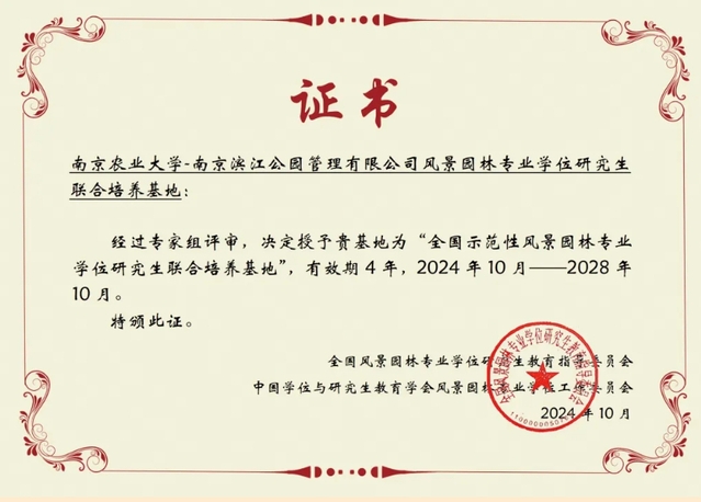 近日,全國風景園林專業(yè)學位研究生教育指導委員會正式公布了2024年“全國示范性風景園林專業(yè)學位研究生聯(lián)合培養(yǎng)基地”名單。南京濱江公園管理有限公司與南京農(nóng)業(yè)大學合作共建的“南京農(nóng)業(yè)大學—南京濱江公園管理有限公司風景園林專業(yè)學位研究生聯(lián)合培養(yǎng)基地”,憑借卓越的聯(lián)合培養(yǎng)成效和深厚的校企合作基礎(chǔ),再次獲此資質(zhì)。