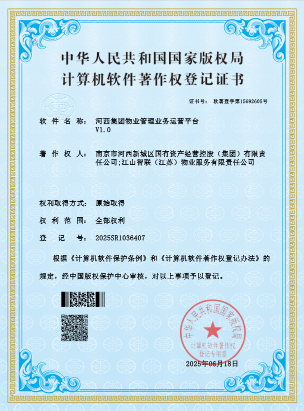近日,河西集團(tuán)物業(yè)管理業(yè)務(wù)運(yùn)營平臺(tái)成功獲得中華人民共和國國家版權(quán)局頒發(fā)的《計(jì)算機(jī)軟件著作權(quán)登記證書》。